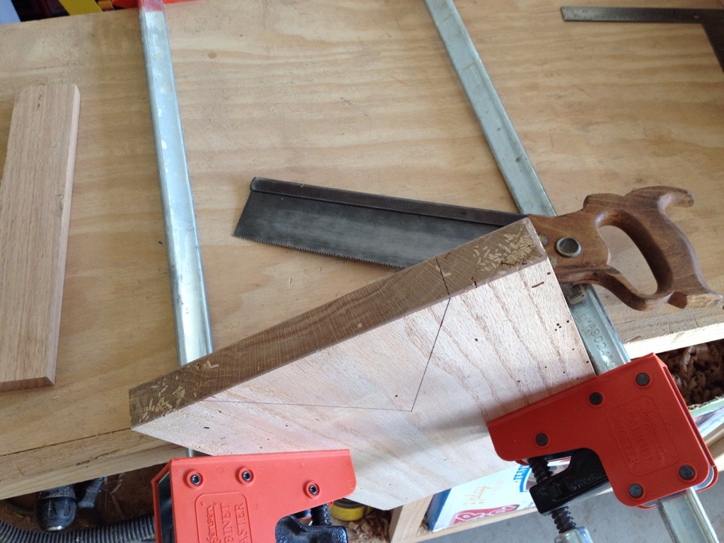 Next,  I was gonna attack cutting an angle on each of the sides. Marked my line 3″ over and 3″ up, put it in my clamp and was gonna cut it the same way as the notch in the legs. I began to put the saw kerf notch in the board with my backsaw. Well, as I mentioned in pt 1, my backsaws are not sharp. My saw just happened to jump, and well….
