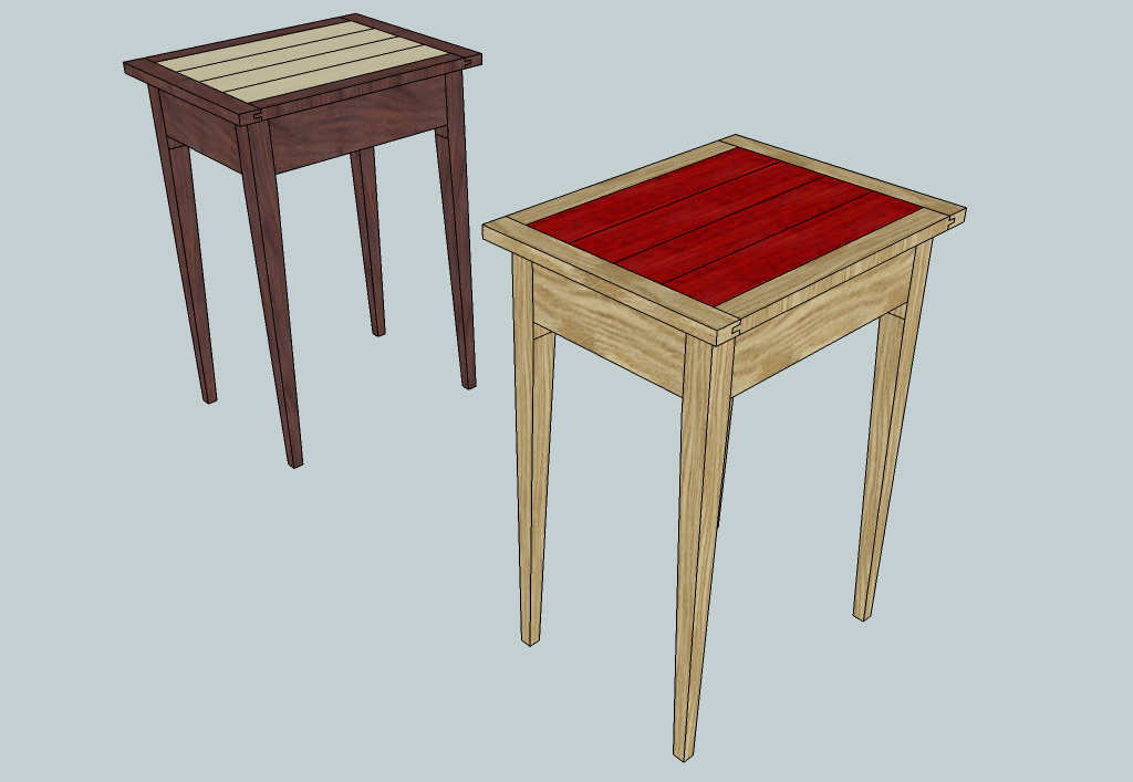 The top is overall 15×19 of a panel of padauk between red oak that has breadboard ends. Never done breadboard ends but a little side table for myself would be the prefect test. I wanna go breadboard ends because I wanted to add contrasting elements to the top while still accounting for wood movement, plus keep the top flat. I plan to go the mortise and tenon route but if all else fails, I’ll settle for tongue and groove and change the dimensions. The only thing I haven’t decided is where to add the drawer. I’m thinking a wider/shallower drawer on the side vs a more narrow/longer on the end.