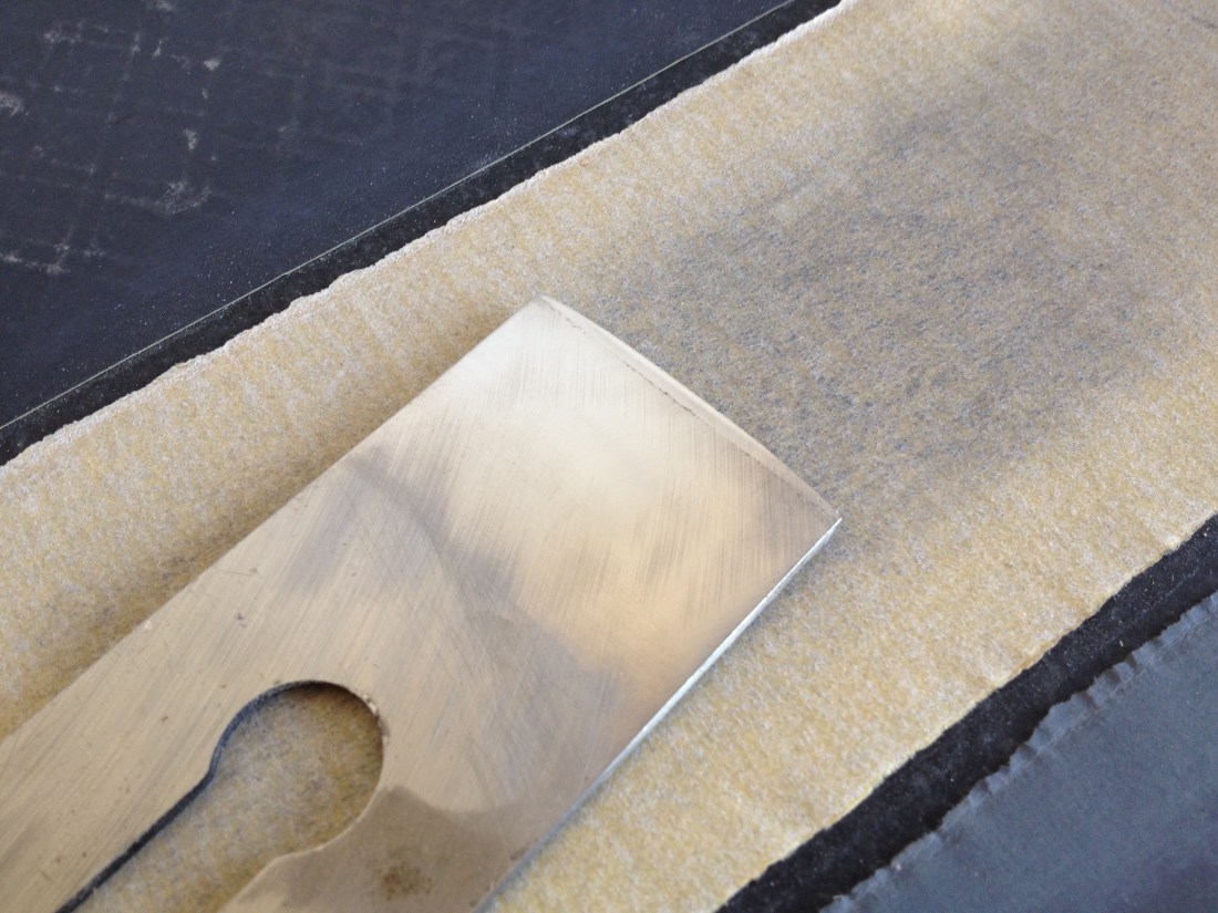 To get things started, I did use my Veritas MkII jig set at 30° using the scary sharp method. I know the roller is long and hard to rock but since I wasn’t relying on it to keep things flat, I just lifted and rolled until I had enough of the angle established to continue sharpening by hand. For this portion I focused on sanding down the outside edges and getting them to develop the shape for a cutting edge before actually trying to sharpen the blade the whole way across. Once I sanded down the blade enough that it started to look like I could be sharpened evenly, I used Shannon’s method of starting a one corner of the sandpaper and pulling it across and rocking it to its opposite corner trying to overlap in the center.