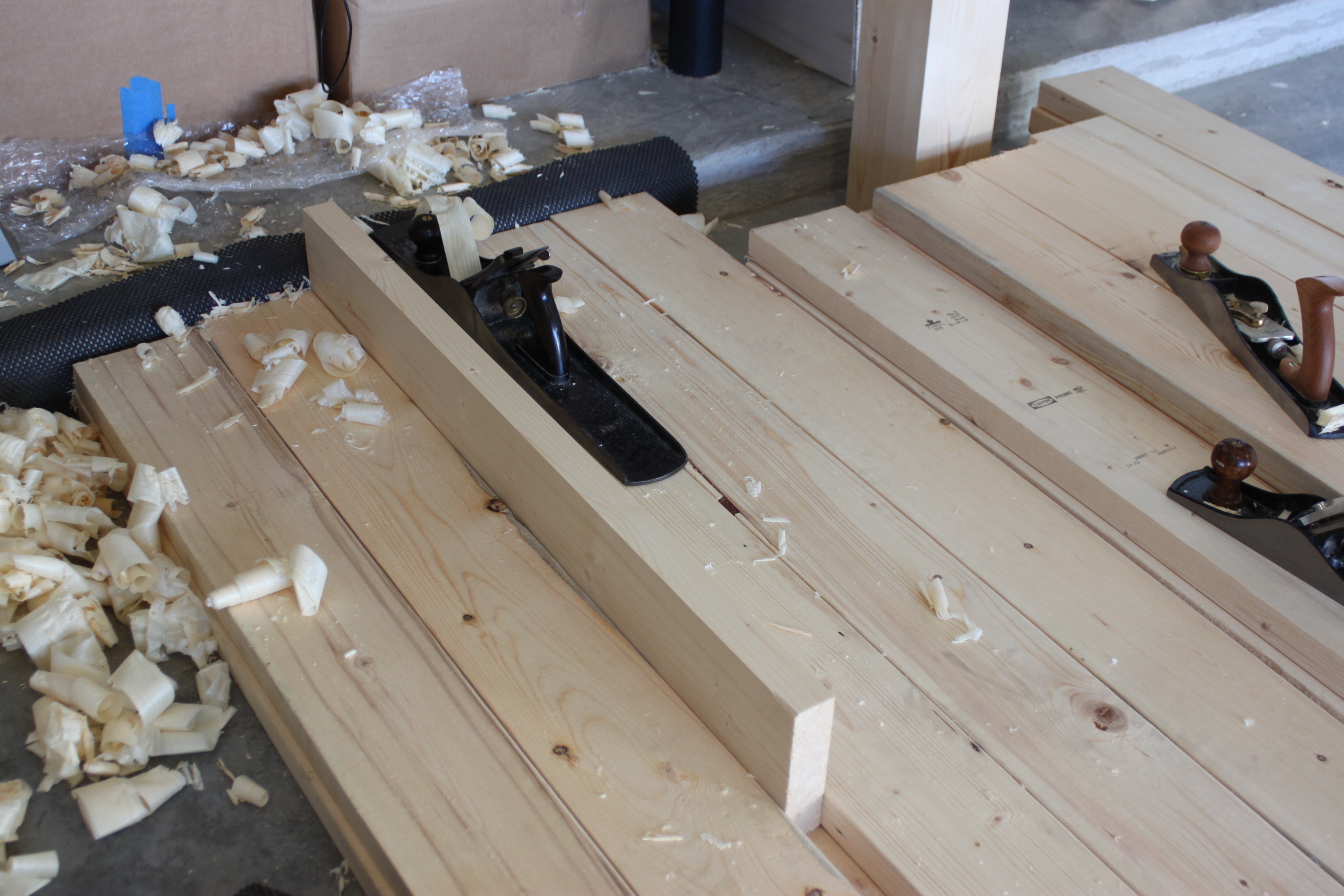 Luckily I have this raised concrete section of my garage that I’ve placed ten 2×6’s, five across double stacked right up against. This acts as my planing stop and elevates my work. It’s rough on the knees (no jokes) but I bunch up some drawer non-slip padding and it helps.