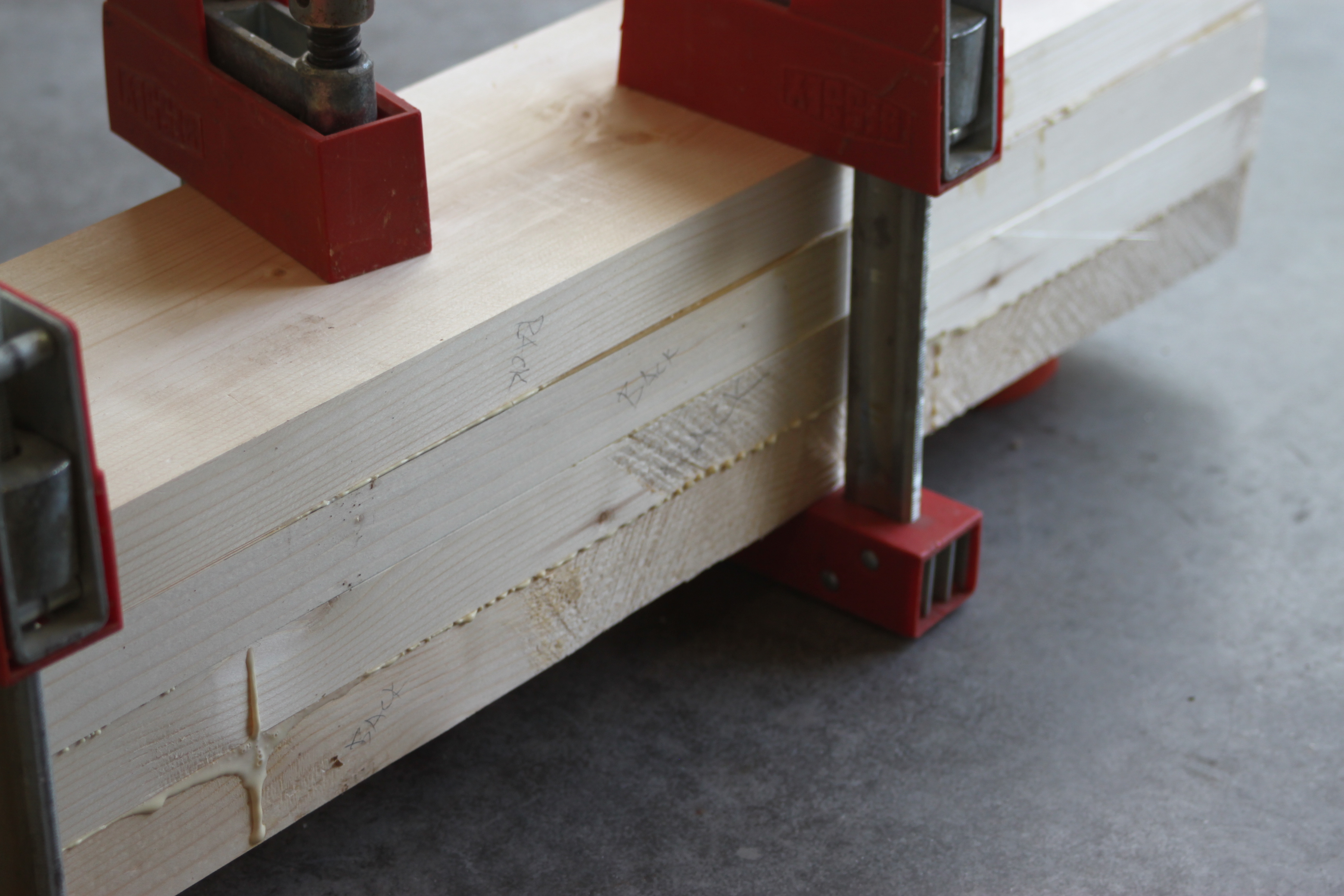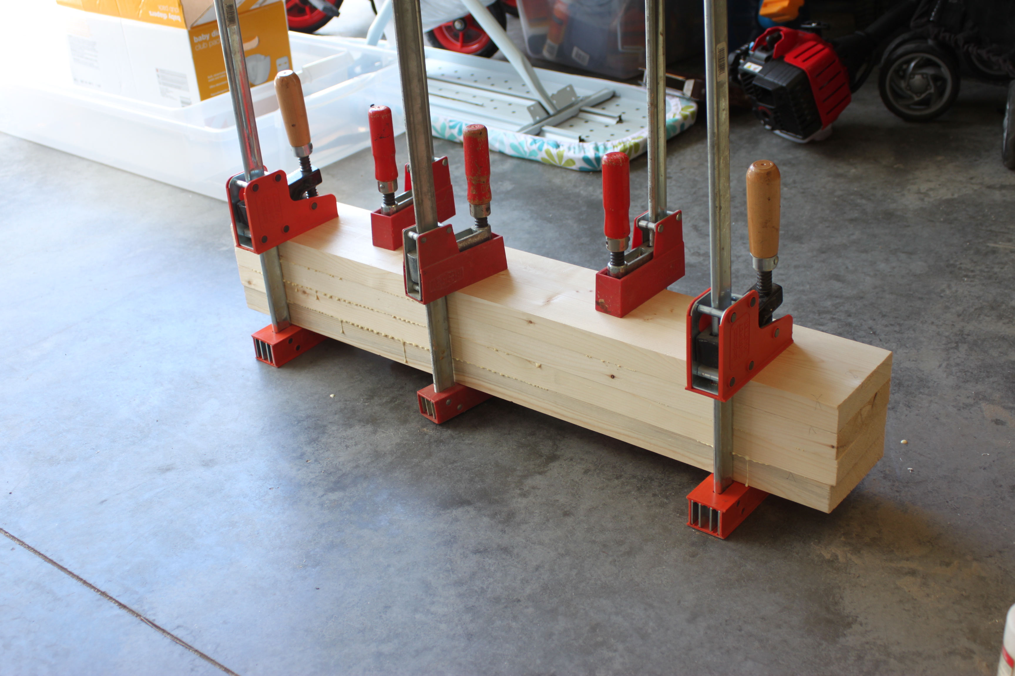 After two faces and an edge are planed, I ripped the board down to about 5-1/8″. Once I have four pieces ready to go, it’s just a matter of clamping them up. When I laminated them, I was just focusing on getting each jointed edge as flush as possible.