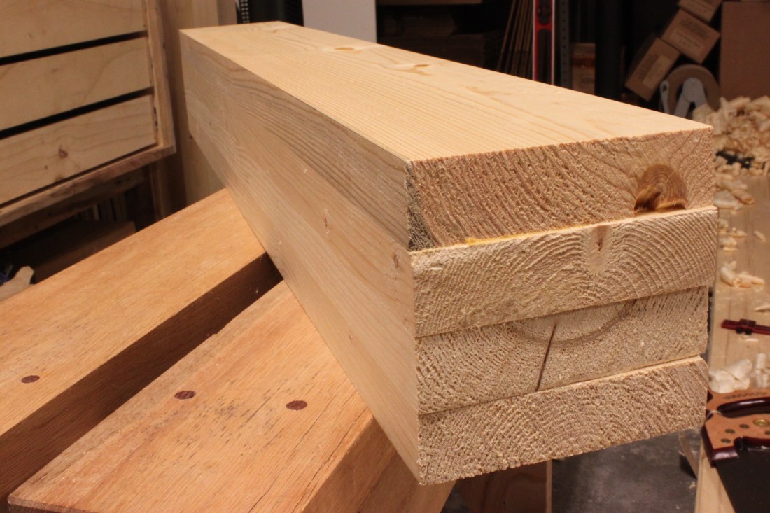 After the leg set for a few hours, I took it out of the clamps and cleaned up and re-flattened the edge and re-jointed an adjoining face. Now it was just a matter of squaring everything up to the final dimensions of 5×5. Even though it’s pine, taking the thickness down with the my “scrub plane “was a complete pain. I mean come on, I’m doing this stuff on the ground. Finally, after some tweaking, I have my 5 x 5 leg.