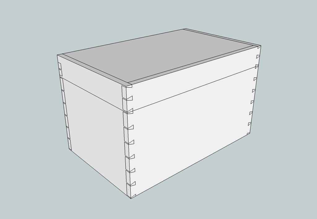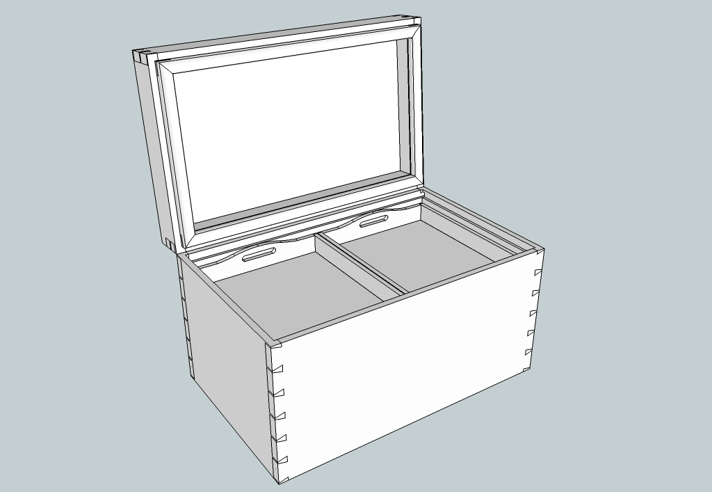I may be giving my SketchUp skills more credit that what my woodworking skills will be able to produce but we can all dream right? Now here’s a few things that are specific to this chest. There are four different types of dovetails on it; a through dovetail (case), a half blind dovetail (trays), a sliding dovetail (lid), and a miter dovetail (shadow box). The hardest part of designing this chest was making it sell-able. Let me explain. If I sold this case, the question that kept stumping me was “how do I enable someone to access the mounting board of the shadow box and reassemble it after they are done?”